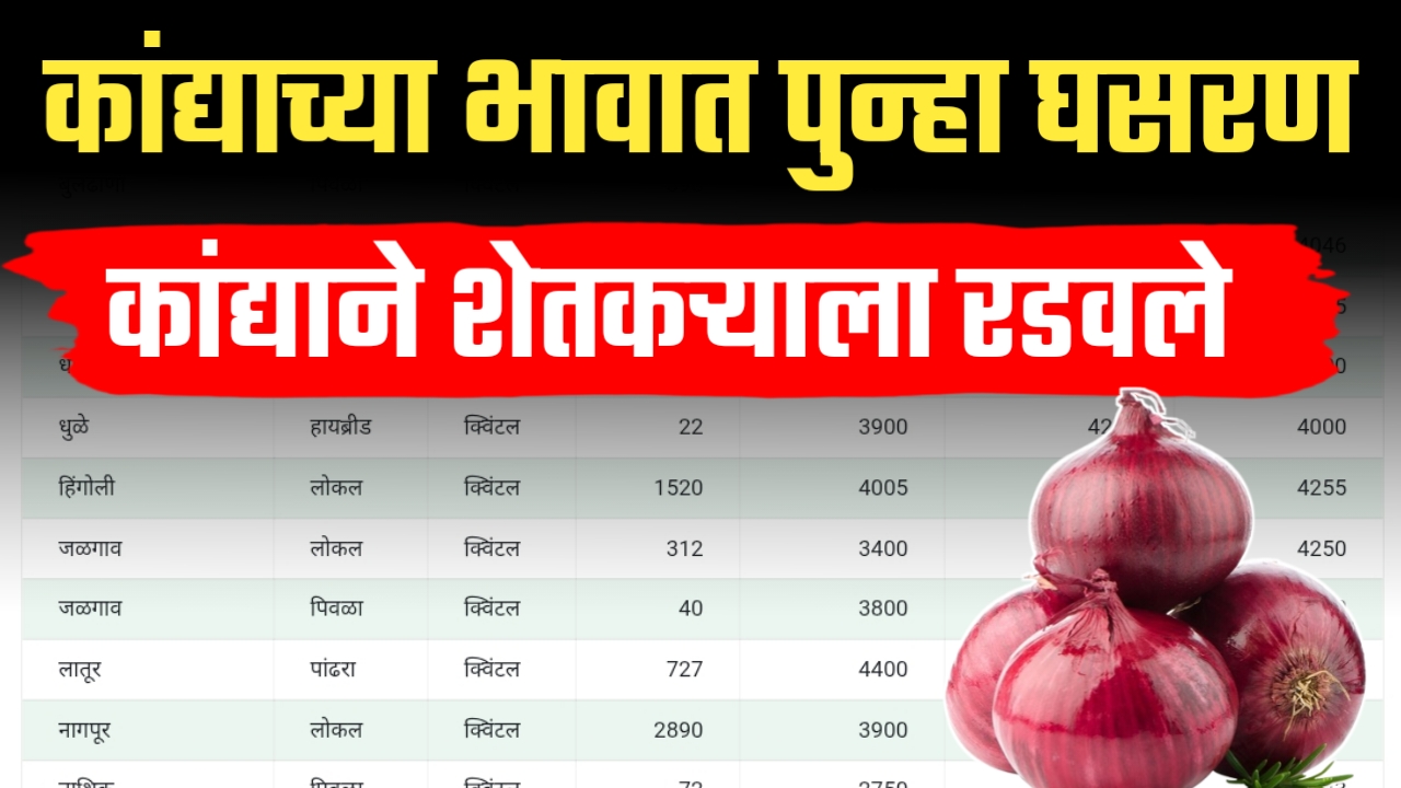 राज्यातील कांदा बाजारात आवकेचा महापूर आल्याने दरांमध्ये मोठी घसरण झाली आहे, ज्यामुळे शेतकरी मोठ्या आर्थिक संकटात सापडले आहेत. सोलापूर येथे १५,९७७ क्विंटलची प्रचंड आवक झाल्याने सर्वसाधारण दर अवघ्या ९५० रुपयांवर आला आहे, तर पुणे येथेही ९,८६२ क्विंटलच्या आवकेमुळे दर ११०० रुपयांवर स्थिरावला आहे. नाशिक विभागातील पिंपळगाव बसवंत येथे ९,००० क्विंटलच्या आवकेमुळे दर ११०० रुपयांपर्यंत खाली आले आहेत, तर मालेगाव-मुंगसे येथे तर दर ८२५ रुपयांपर्यंत कोसळले आहेत, ज्यामुळे तेजीची अपेक्षा पूर्णपणे भंग पावली आहे.